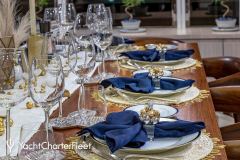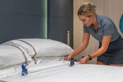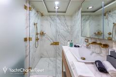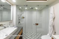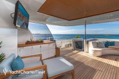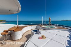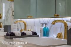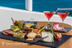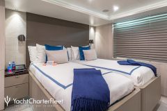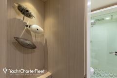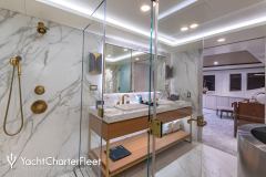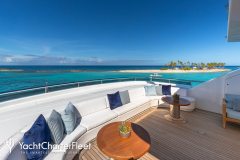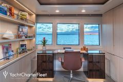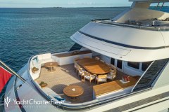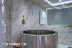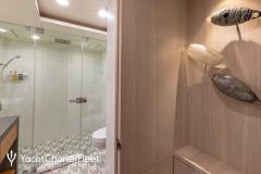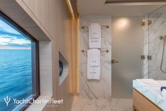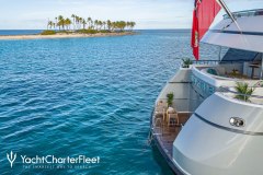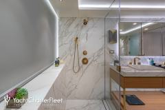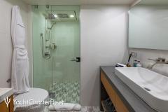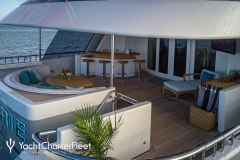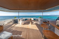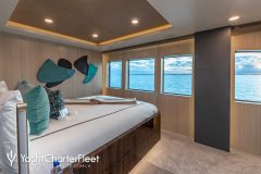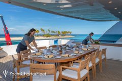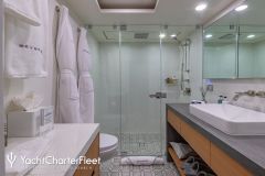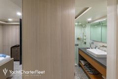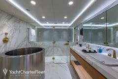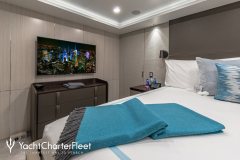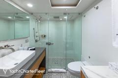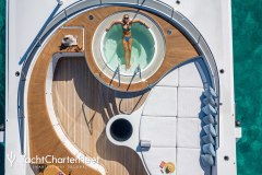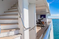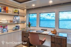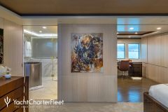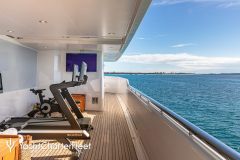 Cool, calm and casual interior, Massage and fitness deck, Full beam master cabin with office and adjoining VIP cabin, Alfresco gym and massage area on upper deck, Excellent selection of water toys,