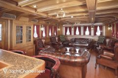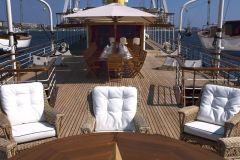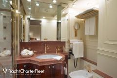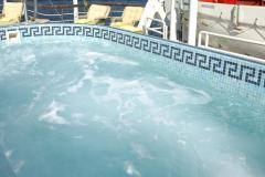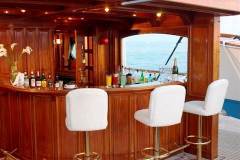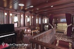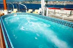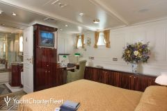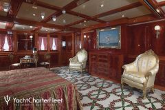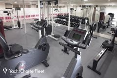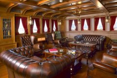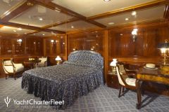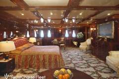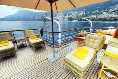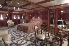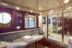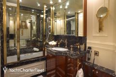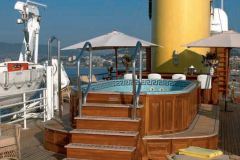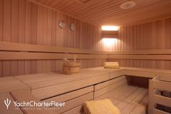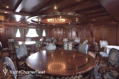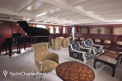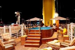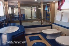 Sleeps up to 26 guests, Palatial interior design by Tiffany's of New York, 4 generous teak decks courtesy of her 10.8m wide beam, Beautiful mosaic-tiled swimming pool, Full interior bar with stools, Gym, beauty salon, Hammam spa and sauna,