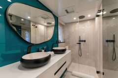 Belldia is introduced primarily as a power catamaran. The the core layout is spread out from the main saloon, which connects to the aft deck. The aft deck is generous, with a prominent dining and seating area and that's where most of the meals are served. The immersive cabins are connected by stairs to the main saloon - roomy, comfortable and pleasant. The cabins offer designer mattrace beds and feature ensuite bathrooms. Multiple portholes provide a connection with the natural world outside.