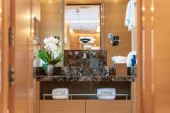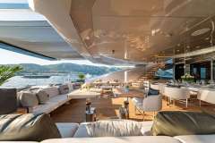 Accommodation is superb, featuring a spacious full-beam owner’s stateroom, two queen VIP staterooms, and two twin staterooms, each with its own en-suite bathroom. The sundeck is a true highlight, furnished with stylish black lounge seating and oversized parasols, creating the perfect space to relax and entertain. Guests can unwind in the Jacuzzi, enjoy a leisurely lunch with panoramic Mediterranean views, or settle in for a movie under the stars at the open-air cinema.