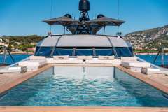 Her standout features include a sleek contemporary interior, an expansive open sundeck with an open-air cinema, an infinity Jacuzzi on the aft deck, a second Jacuzzi on the flybridge, and an impressive 25-foot (8-meter) pool on the foredeck. Built for speed as well as elegance, DB9 cruises comfortably at 22 knots and reaches a thrilling top speed of 30 knots, ensuring swift and stylish passages between destinations.