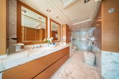 Full beam Master stateroom is located aft with a separate entrance from the main salon, featuring King size bed large open room with sofa and plentiful storage.Master bath is open and airy with dual sinks, large tub and separate Shower and WC.