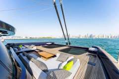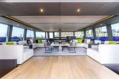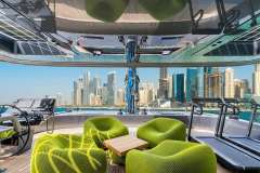The main deck saloon is designed for relaxed socialising, with panoramic windows, oversized seating, a flexible dining area, and a forward bar with piano and pop-up TV. Outdoor spaces include an expansive flybridge with sun beds and wet bar, and a full-beam aft cockpit with direct access to the swim platform.