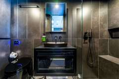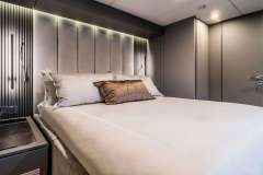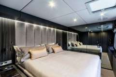 Accommodating up to eight guests, Marie Joseph features a well-balanced four-cabin layout ideal for families or groups of friends. The starboard hull is dedicated to a spacious, light-filled master suite with a seating area, vanity desk, walk-in dressing room, pop-up TV, and ensuite bathroom. Additional accommodation includes a generous VIP cabin and two identical guest cabins, each offering comfort and privacy.