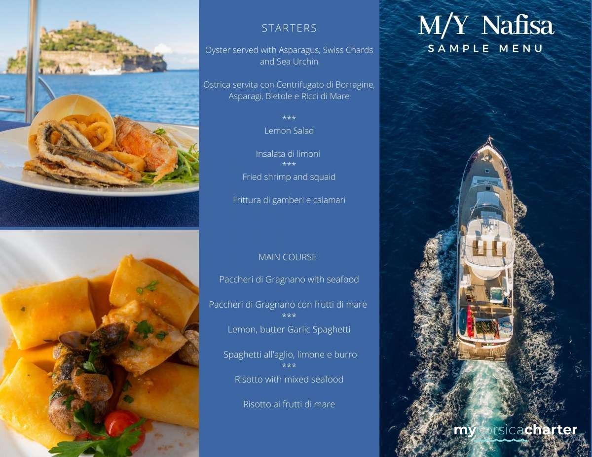 For a motor yacht like NAFISA, the expected APA is 25% to 40% of the charter price (€8,500 - €13,600), making the charter cost €42,500 to €47,600. Exact amount will be confirmed after inquiry.