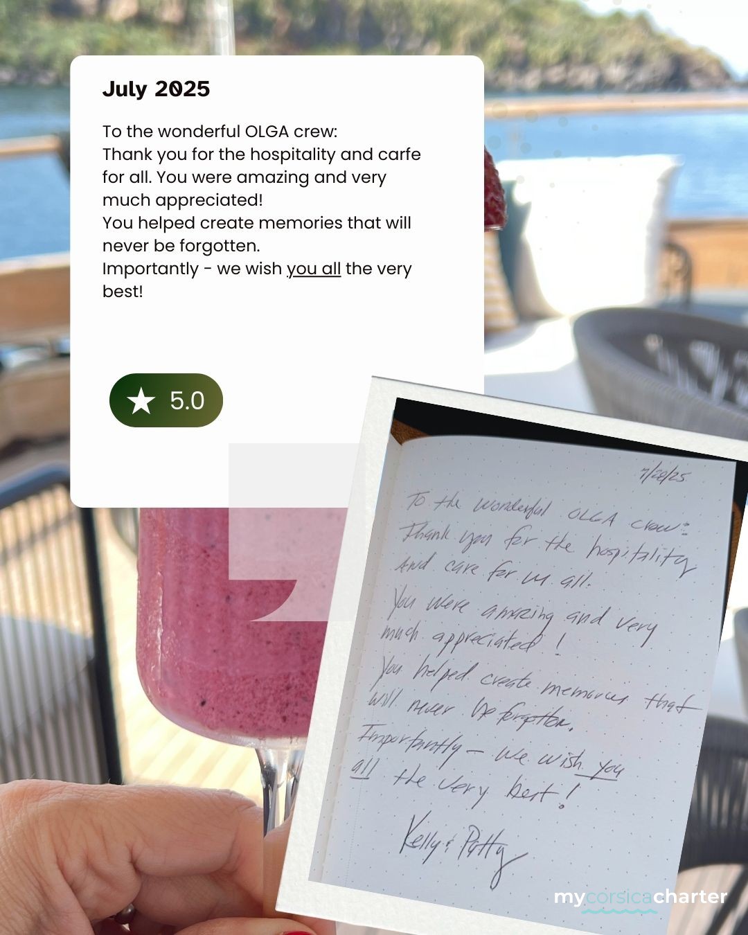Dear crew of the Olga: Diana — Francesco Jr, Francesco Sr, Enrico and Michela — you’ve made these holidays unforgettable. You helped us feel comfortable, free and happy. Thank you for your kindness, generosity and for embracing the little craziness of us old folks. A big hug. I’m sure we’ll meet again.