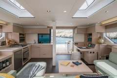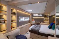 Smiley is offered primarily as a sailing catamaran. The the core layout is spread out from the main saloon, which connects to the aft deck. The aft deck is expansive, with a comfortable dining and seating area and usually it is where you, as a charter guest, spend most of your time. The fascinating cabins offer unbeatable views in the morning and are located just below deck. The cabins offer designer mattrace beds and feature ensuite bathrooms. Multiple portholes provide a connection with the natural world outside.