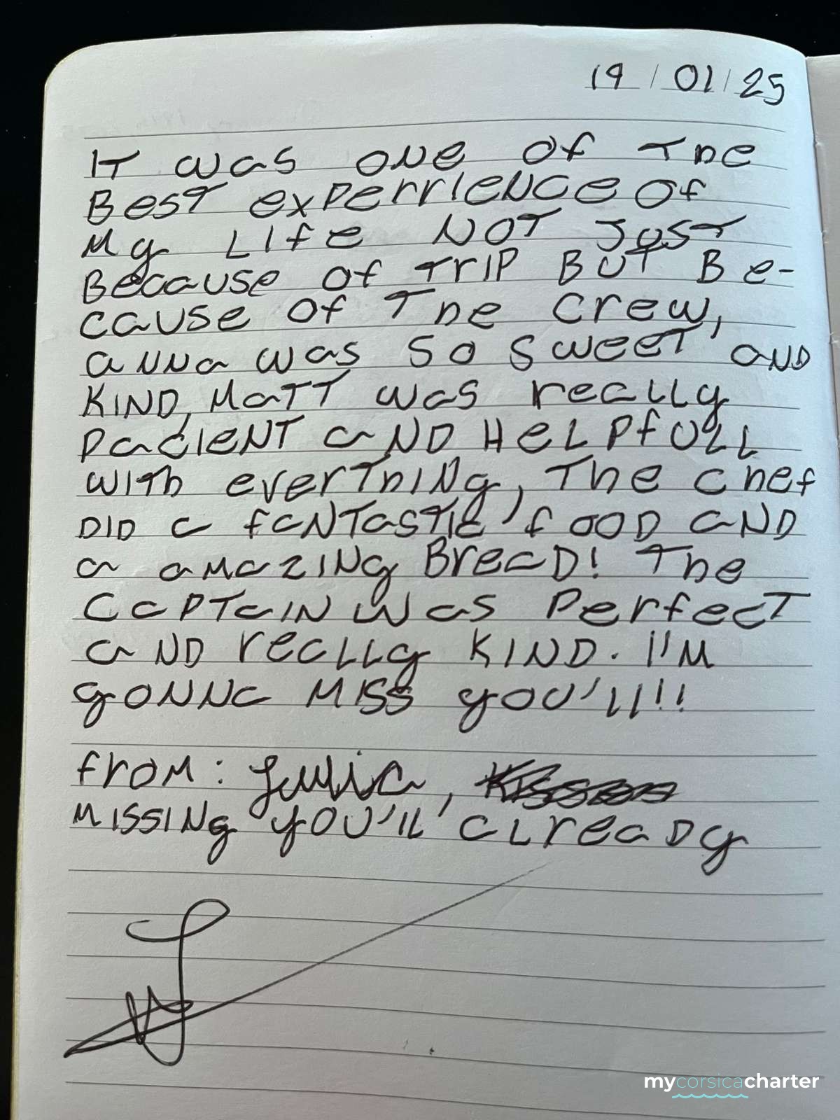 It was one of the best experiences of my life, not just because of the trip, but because of the crew. Anna was so sweet and kind. Matt was really patient and helpful with everything. The chef prepared fantastic food and amazing bread! The Captain was perfect and very kind. I’m going to miss you all!!