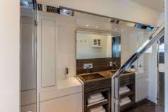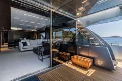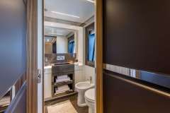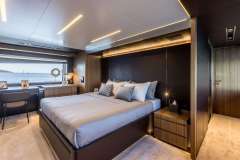 Her distinctive exterior reflects a dynamic and modern profile, while her wide-body configuration enhances interior volume and livability. A highlight of the layout is the expansive master stateroom located on the main deck, offering a private suite typically found on much larger yachts. Below deck, four well-appointed double guest cabins, provide flexible accommodation for up to 10 guests all together.